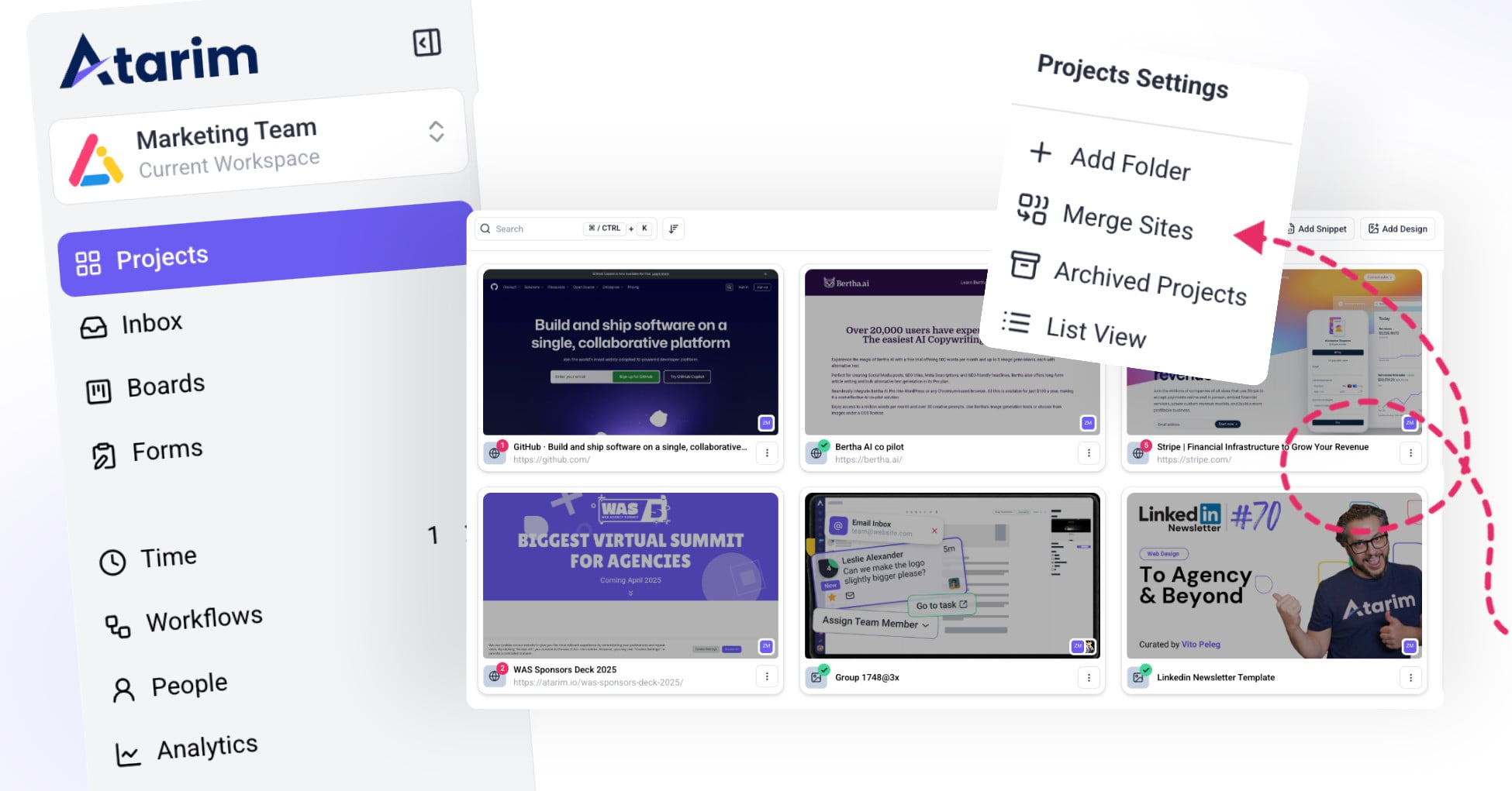 To start merging projects, navigate to the Project Screen in your Atarim dashboard.