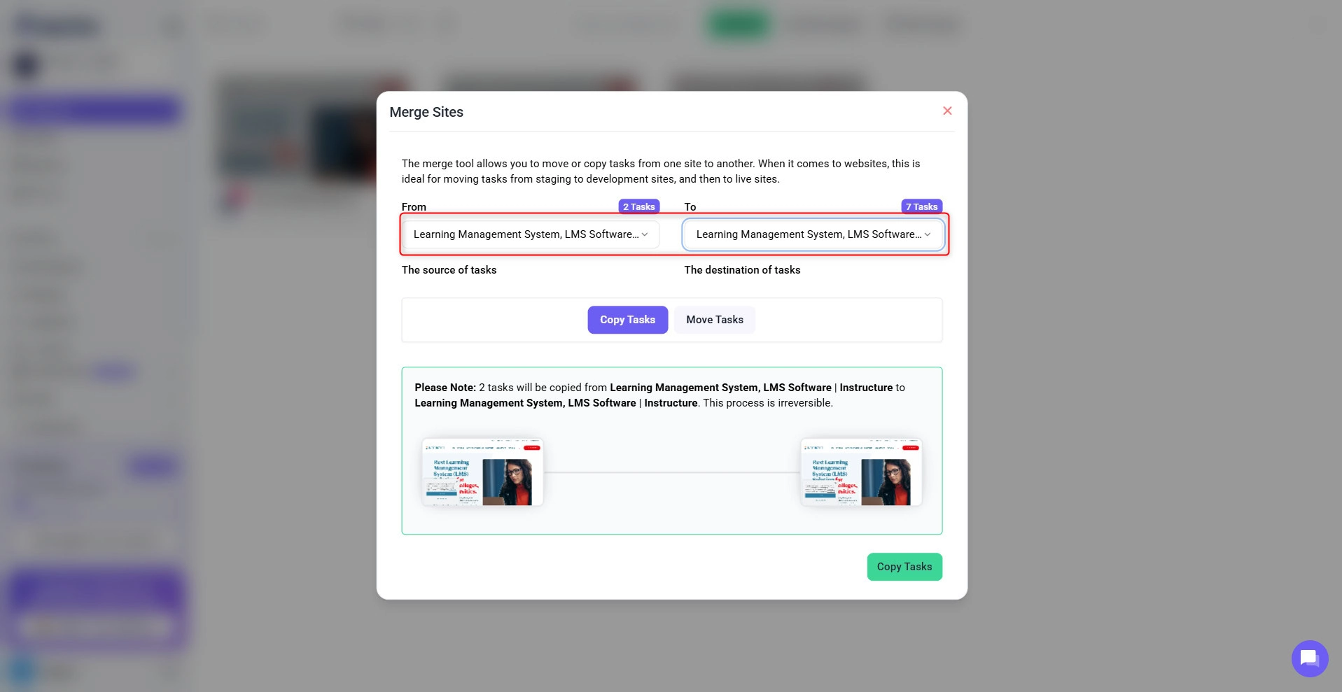 • In the Merge Sites modal, choose the From Project (the one with the tasks to be transferred).