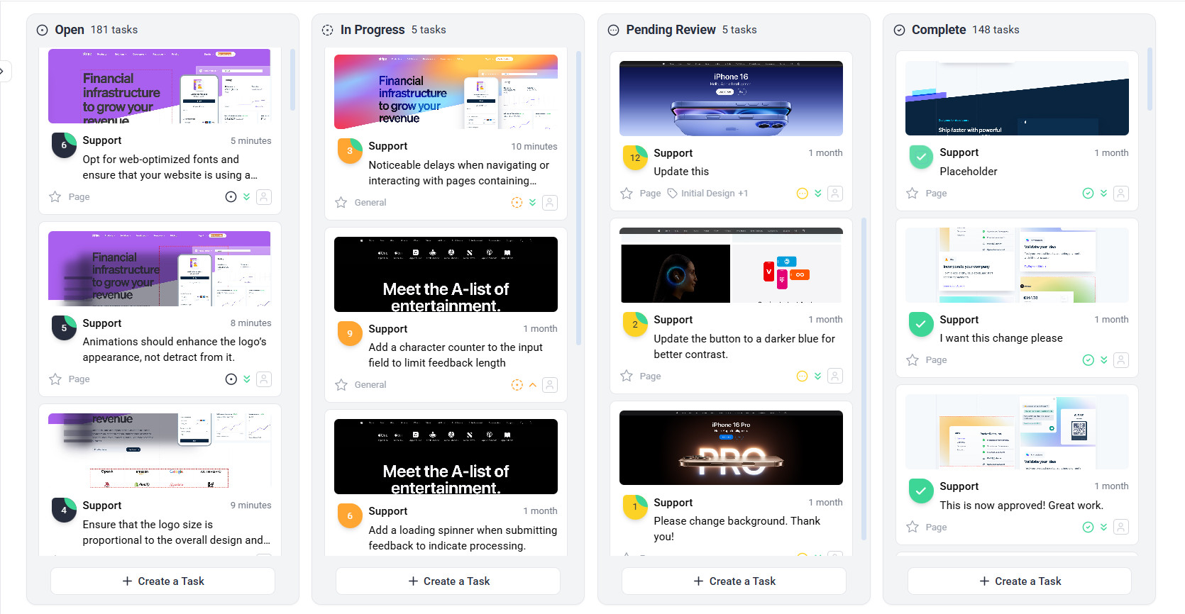 Atarim converts feedback into actionable tasks, gathering additional information automatically to provide more context for the tasks. This includes auto screenshot, browser type, screen resolution, and even the exact URL where the feedback was placed. These tasks can be tracked through the unified Inbox or Kanban boards, allowing teams to manage tasks easily, maintain full clarity on requirements, and monitor progress at a glance.