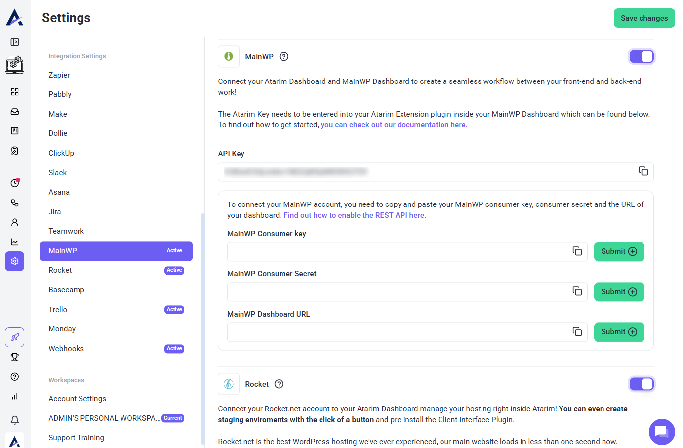 After generating the keys for your MainWP Dashboard, go to the integration settings section inside your Atarim Dashboard. You should have already enabled the MainWP integration in the previous step.