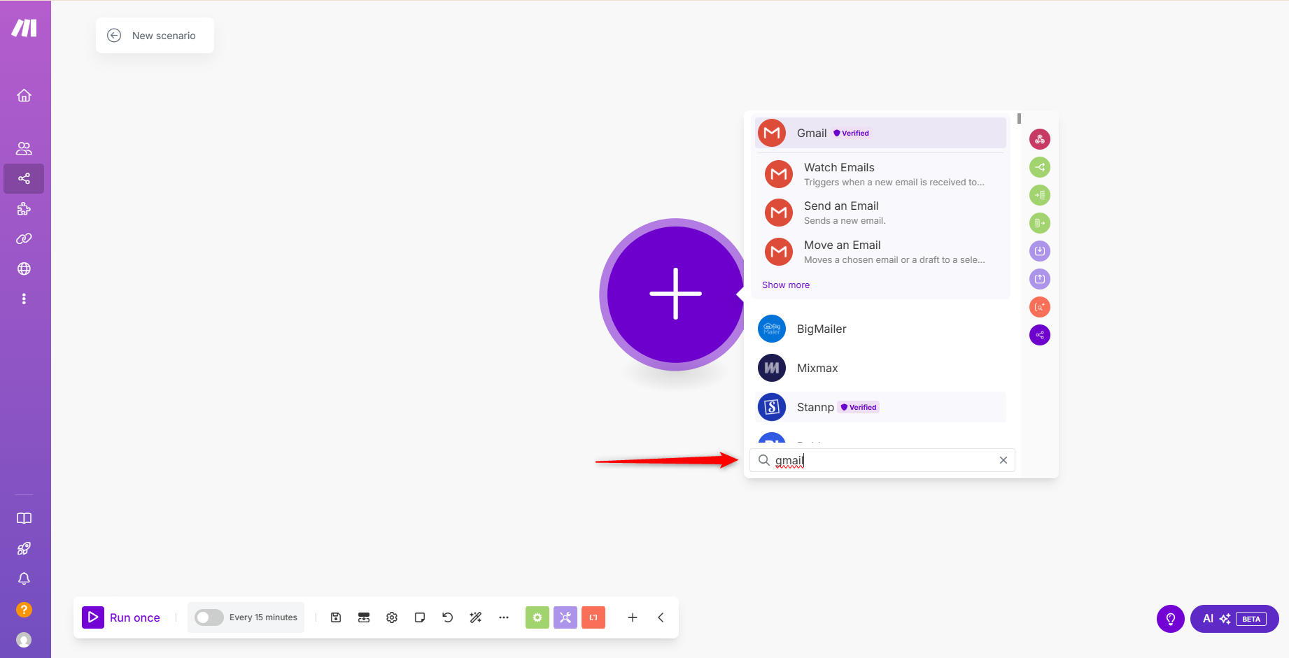 - Start a new Scenario and click the + icon to add a module.
