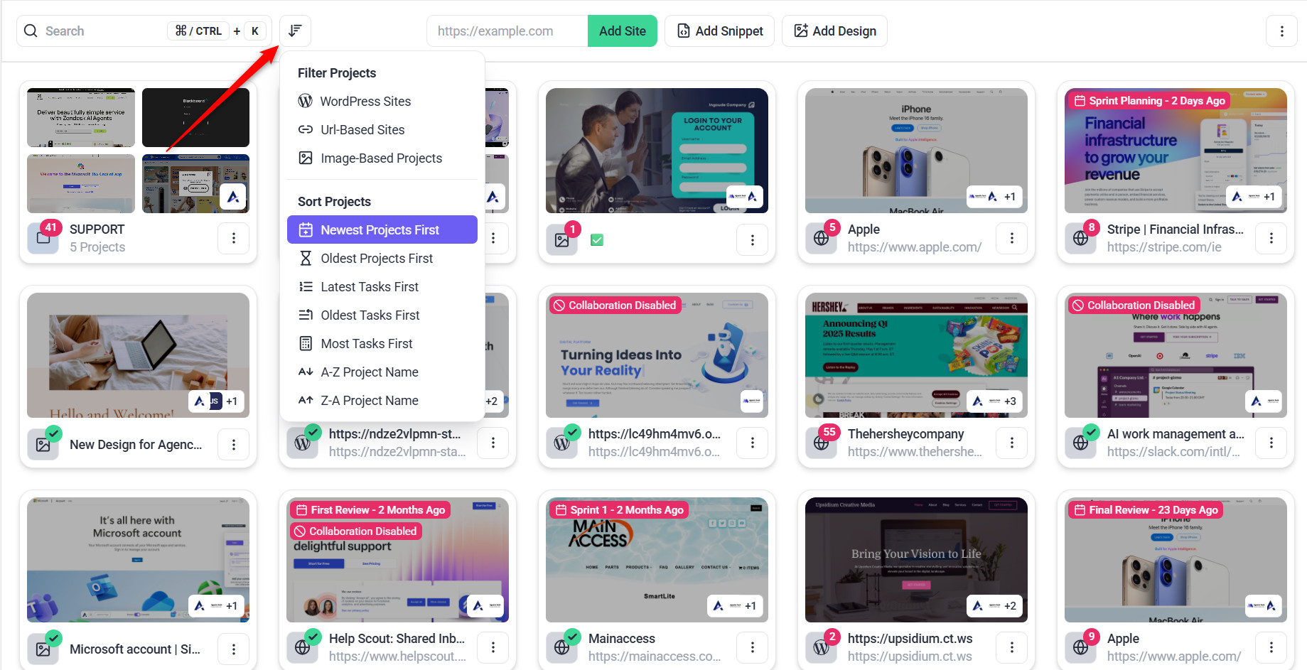 - Add projects using the URL, WordPress plugin, or design upload options.