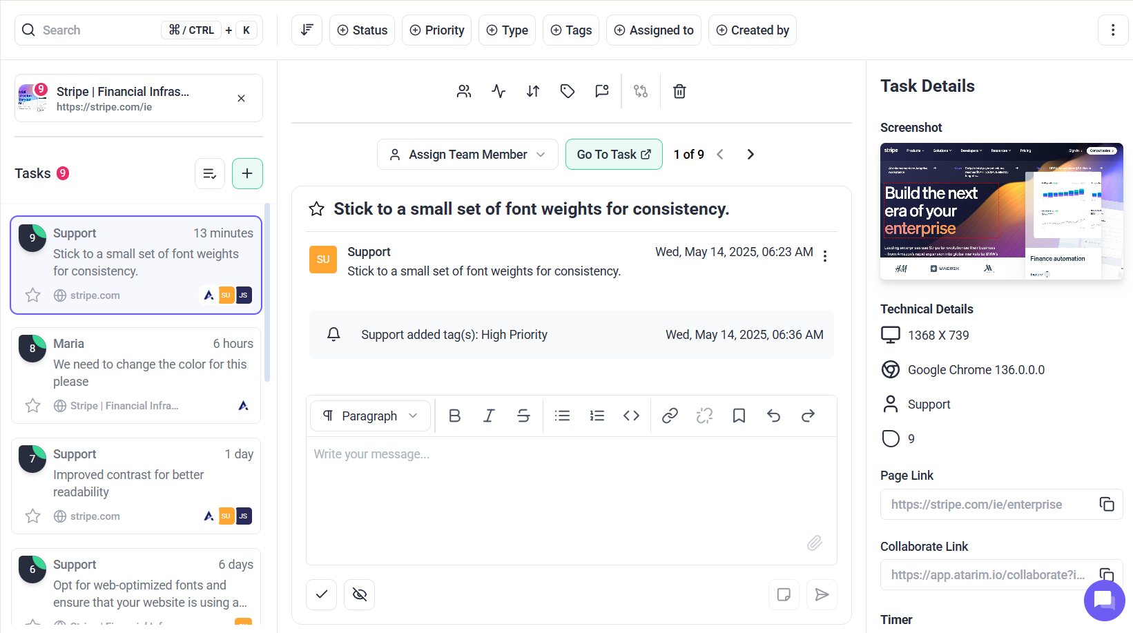 All visual comments instantly become tasks in Atarim’s task dashboard. Team members can track, assign, and prioritize them just like any other task.